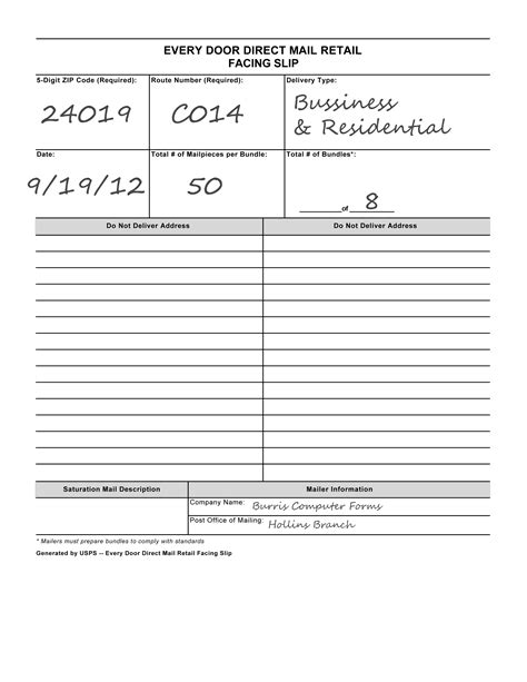 Eddm Facing Slip Sample - Facing slips facing slips are used to indicate the carrier route, quantity, and number of bundles per route. When you sign up for eddm online you can download a facing slip with some of your eddm facing slip information already filled out on it: One facing slip is generated for each route, so make copies as. Every door direct mail.